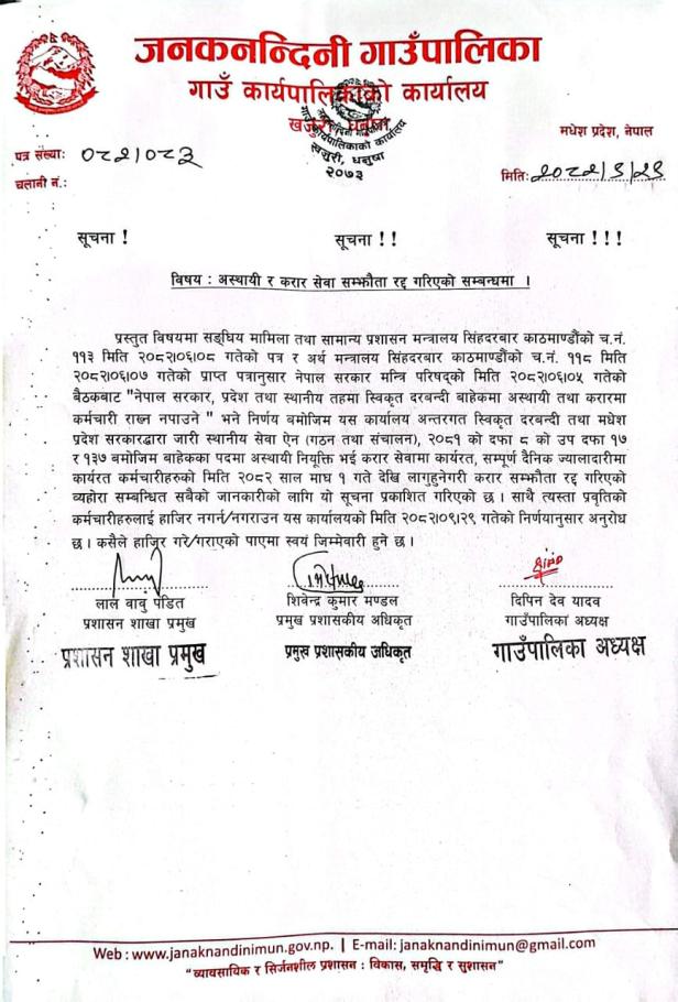 अस्थायी र करार सेवा सम्झौता रद्द गरिएको सम्बन्धमा ।