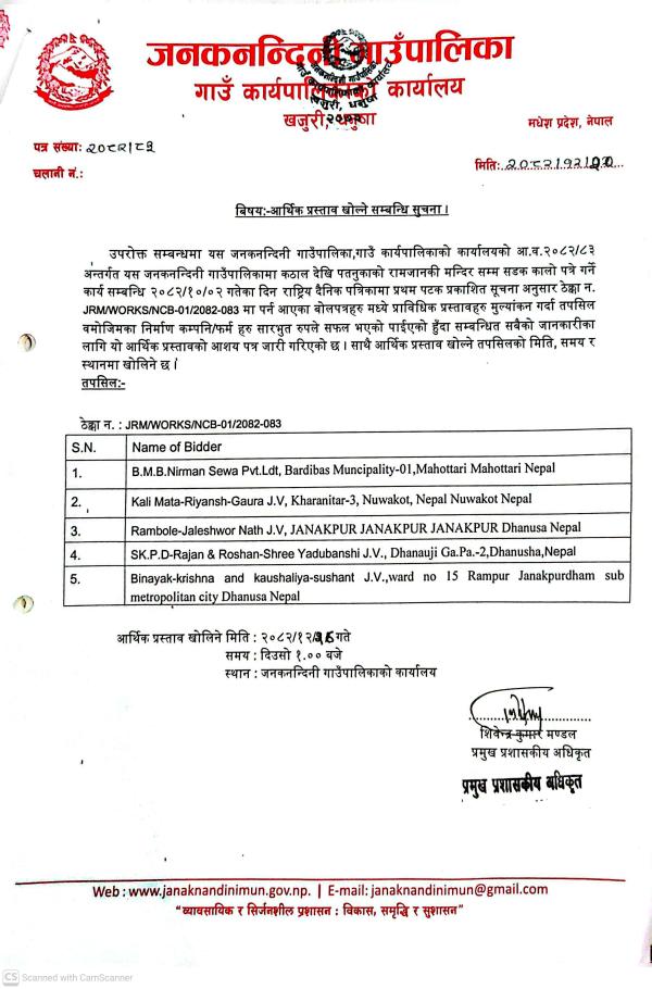 आर्थिक प्रस्ताव खाेल्ने सम्बन्धि सूचना ।