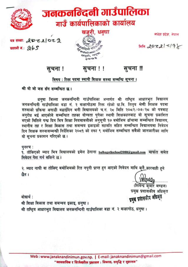 रिक्त पदमा स्थयी शिक्षक सरूवा सम्बन्धि सूचना ।