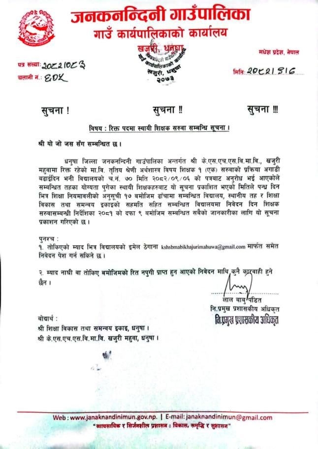 रिक्त पदमा स्थायी शिक्षक सरूवा सम्बन्धि सूचना ।