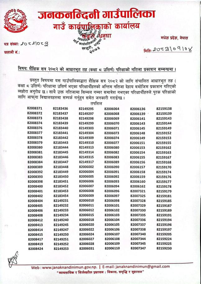 शैक्षिक सत्र २०८२ सालकाे जनकनन्दिनी गाउँपालिकास्तरीय कक्षा ८ काे वार्षिक परिक्षाकाे नतिजा प्रकाशन ।