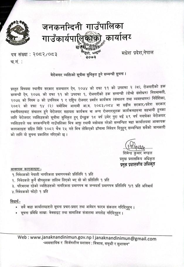 बेरोजार व्यक्तीको सूचिमा सूचिकृत हुने सम्बन्धि सूचना ।